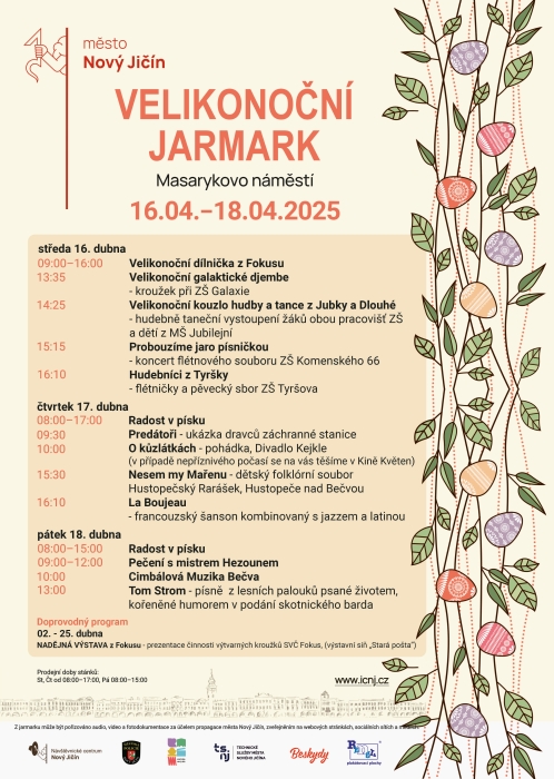 Těšit se můžete na množství velikonočních stánků s rukodělnými výrobky, velikonočními dekoracemi a dalším pestrým zbožím, včetně chutného občerstvení. Pro rodiny s dětmi budou připraveny různé hry a další aktivity.
